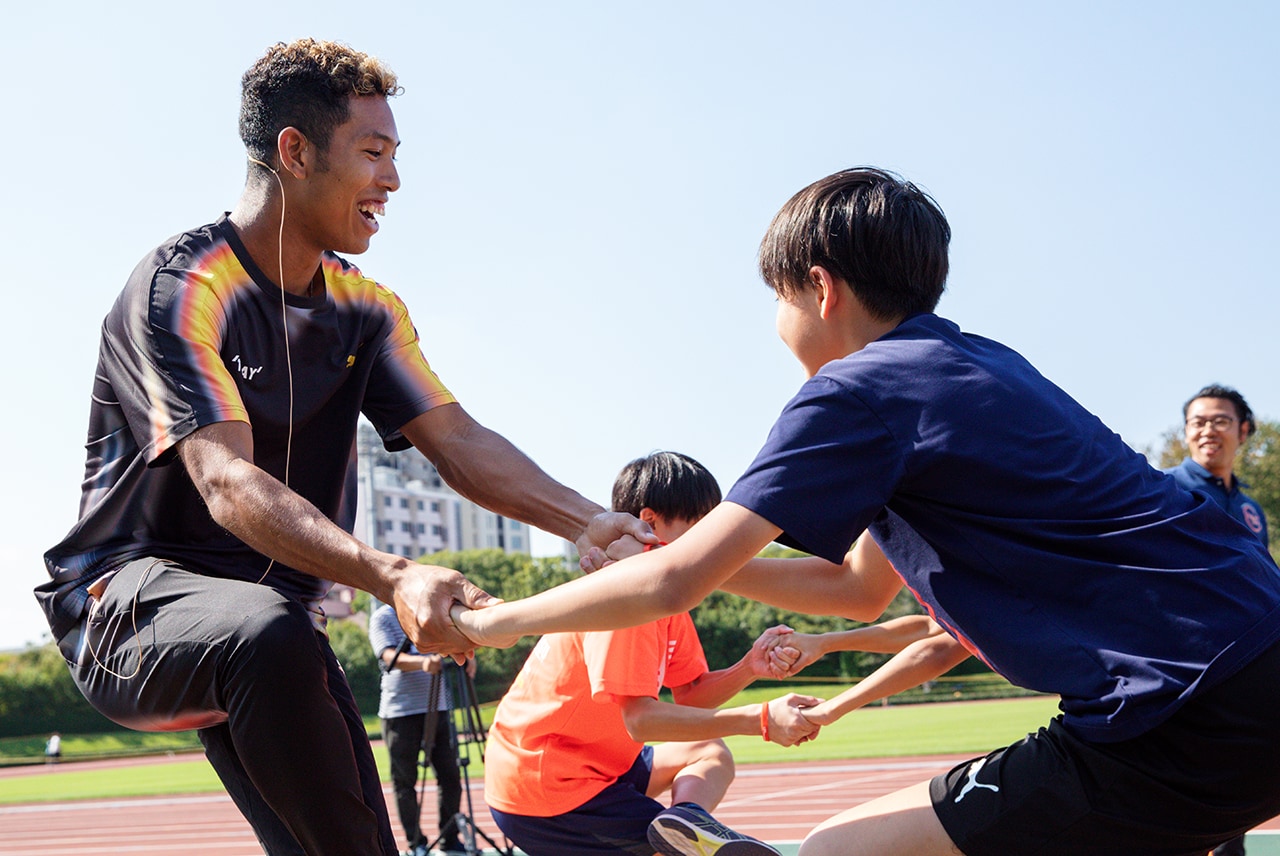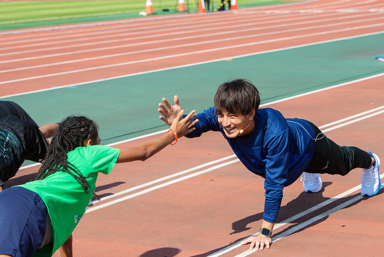 The first event was a special clinic on physical training to be able to run faster. Under the guidance of a trainer, the students worked on exercises with Sani Brown, together with long jumper Yuki Hashioka, who had competed at the Paris Olympics. The difficulty of the training exercises gradually increased, but the children refused to give up. The core training was conducted in pairs, and the children pushed themselves further as they faced the two athletes.
