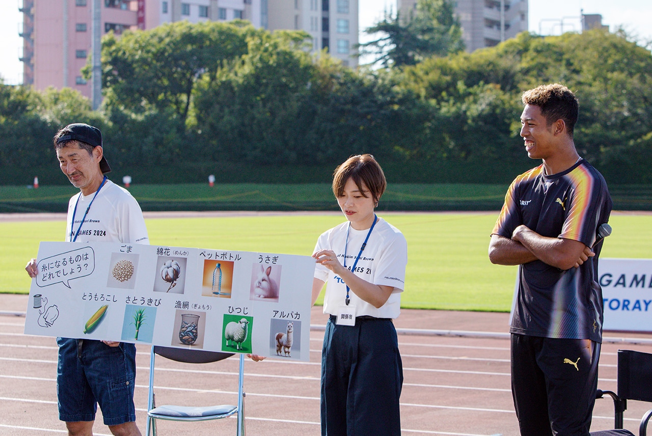Sani Brown, who loves sportswear made from Toray’s quick-drying fabric, told the children, “Sweat dissipates quickly so the T-shirts don’t get heavy, eliminating stress when running. I think everyone who aspires to be a top athlete should know about clothing.”