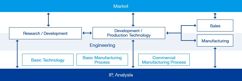 Technical departments develop elemental technologies and processes for commercialization of the results of R&D, and scale up processes using pilot plant and production facilities. The departments collaborate with business divisions to provide product information hearing and technical support to customers, and they promote product design against market needs.